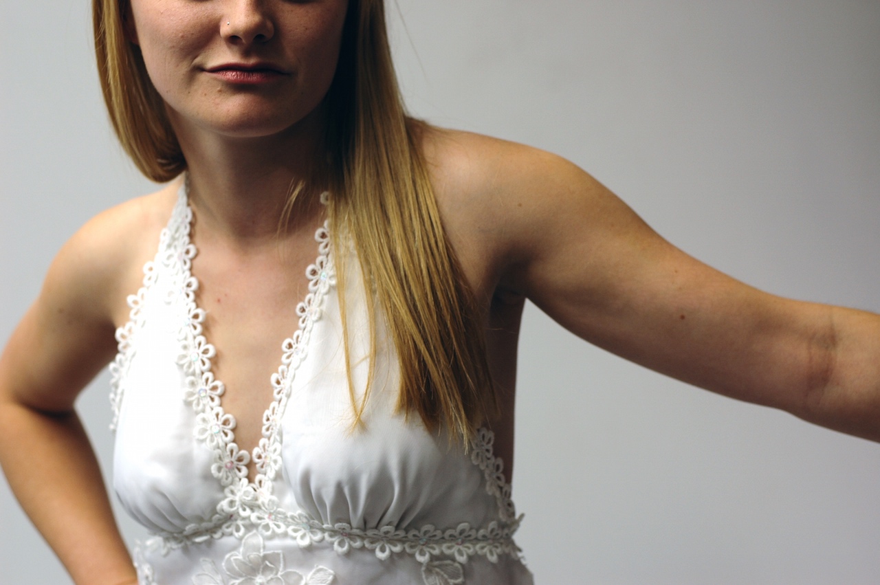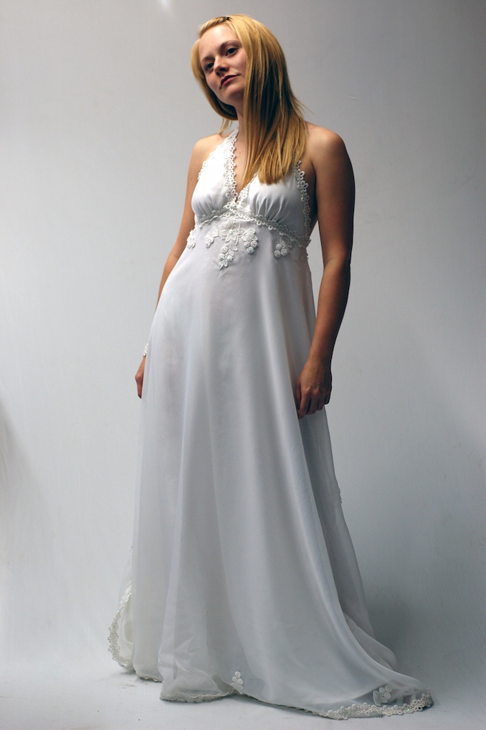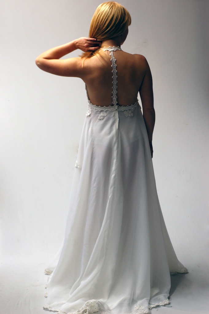 My friend Deniz wanted me to customise her mothers wedding dress for her own wedding. I wish I had a photo of the original but I don’t. It had long sleeves and a high collared neckline. After a bit of butchering here is the outcome…