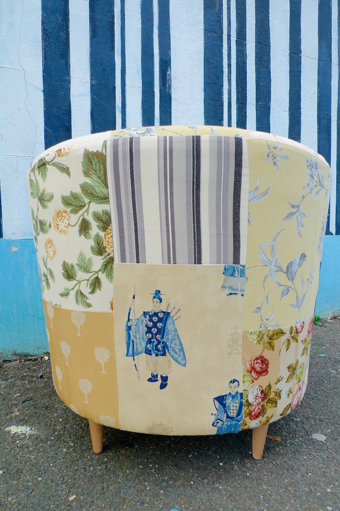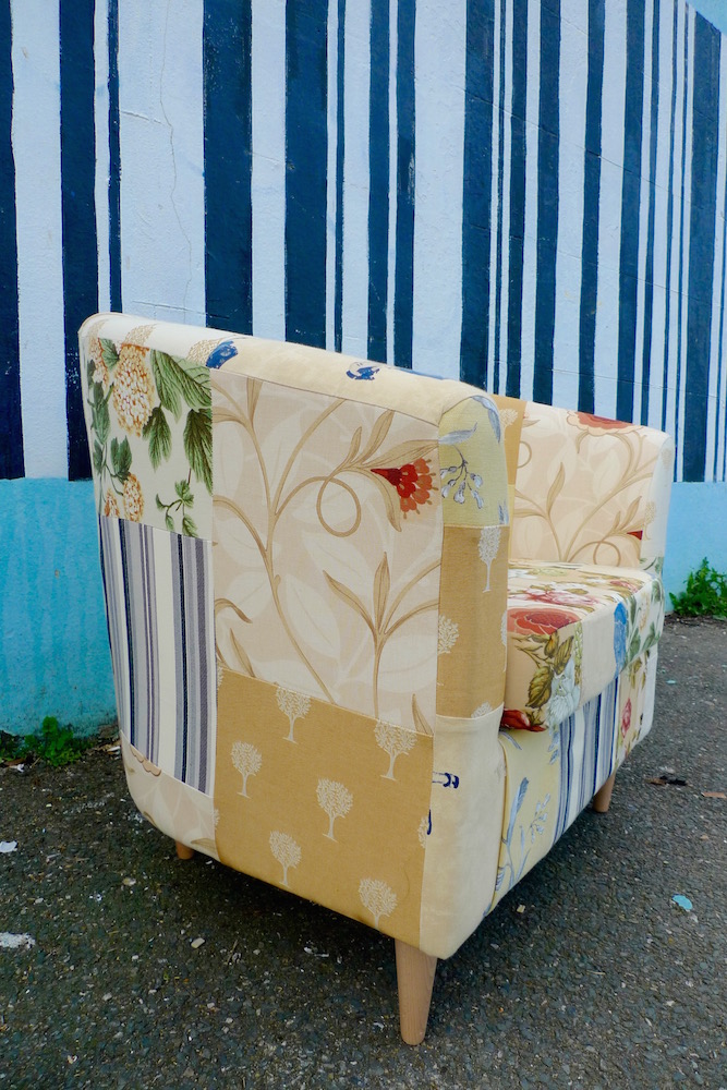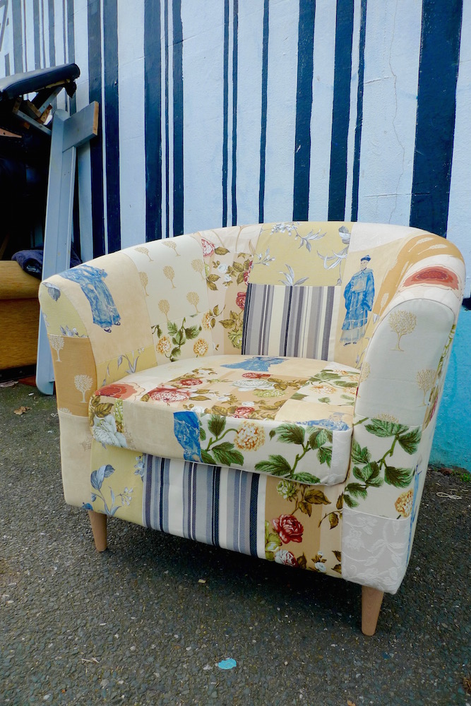 It’s been too long since I reupholstered a tub chair. I love doing them as I can use off-cuts I have left from other projects plus the actual re-upholstery job on these are pretty straight forward. I always go for very bright colours but I have been told that even tough people like them it wouldn’t fit into their (beige) decor. So I made one in fairly neutral colours. Lets see if it will have any takers. Avalaible at Shabitat.