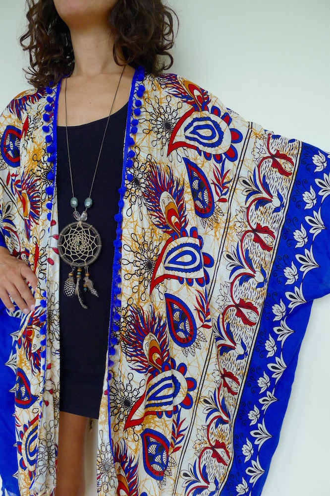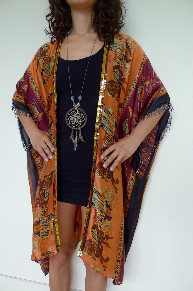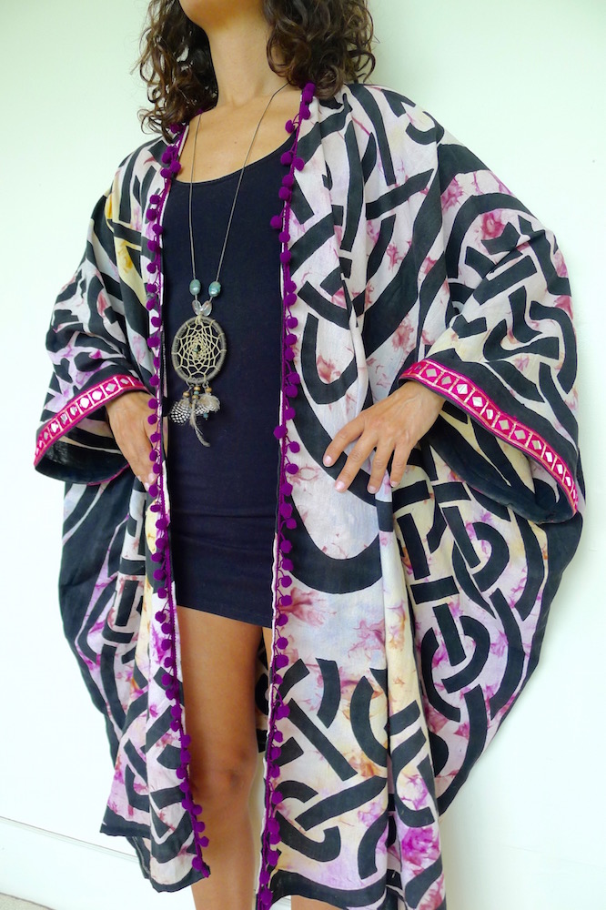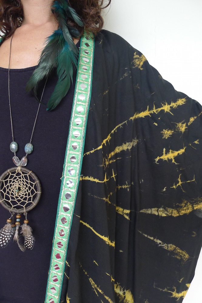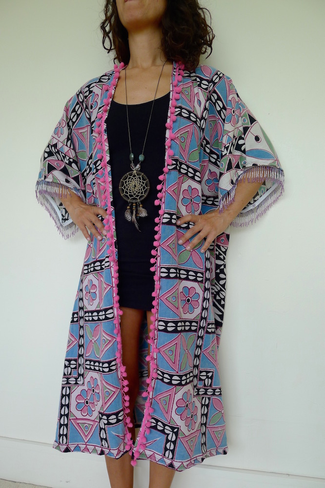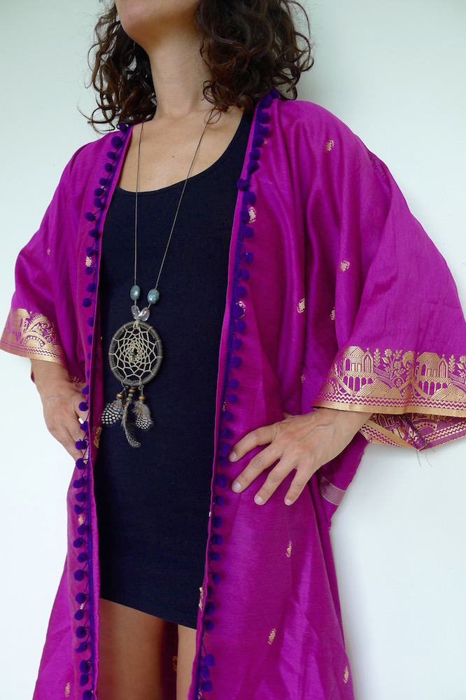 I really love making these kimonos. Well, they aren’t strictly kimonos, but a floaty summer layer inspired by. They are made from saris, sarongs and any other reusable fabric that comes my way. The trimmings I do buy new from my travels, the rest is all upcycled goodness.