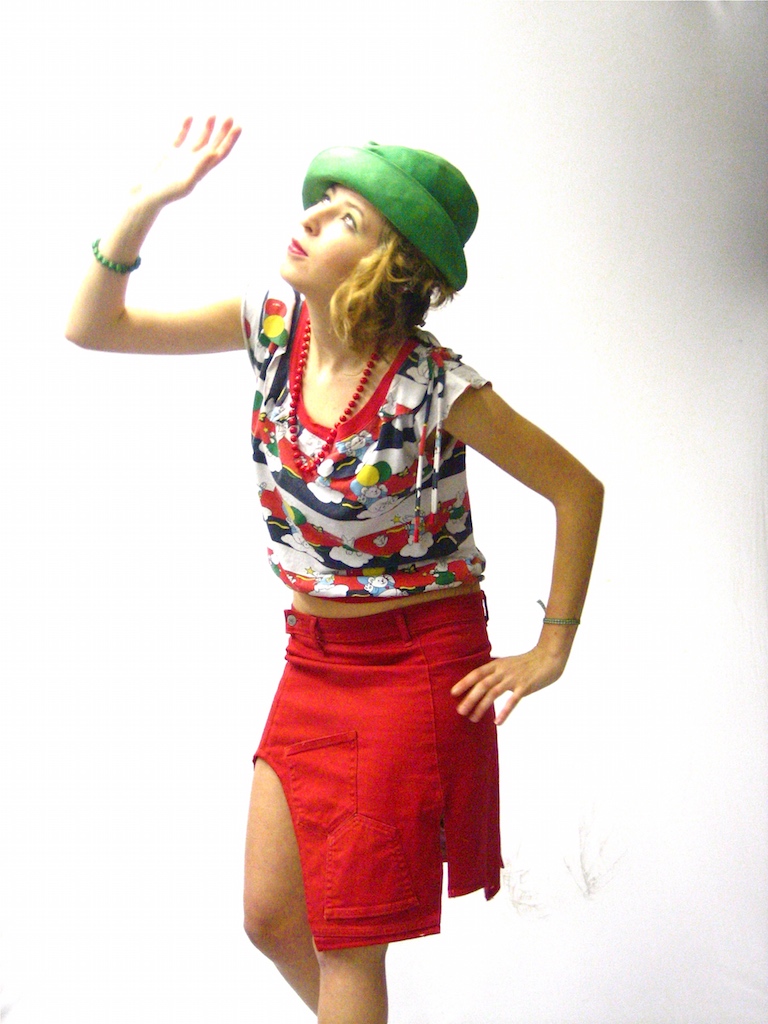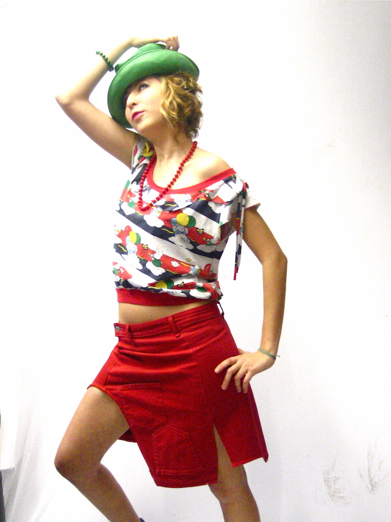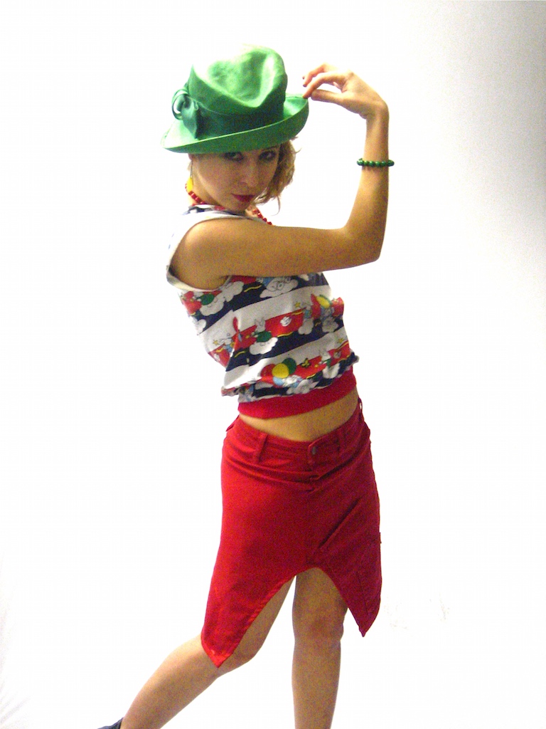 Here we have my good friend Yasemin modelling for me. Denim skirt made from a pair of red denim trousers. No extra pesticides or water used. Jersey top customised for kids pyjama tee. No sweatshop labour. Hat vintage. All locally sourced made in our studio powered by green energy and cups of peppermint tea.