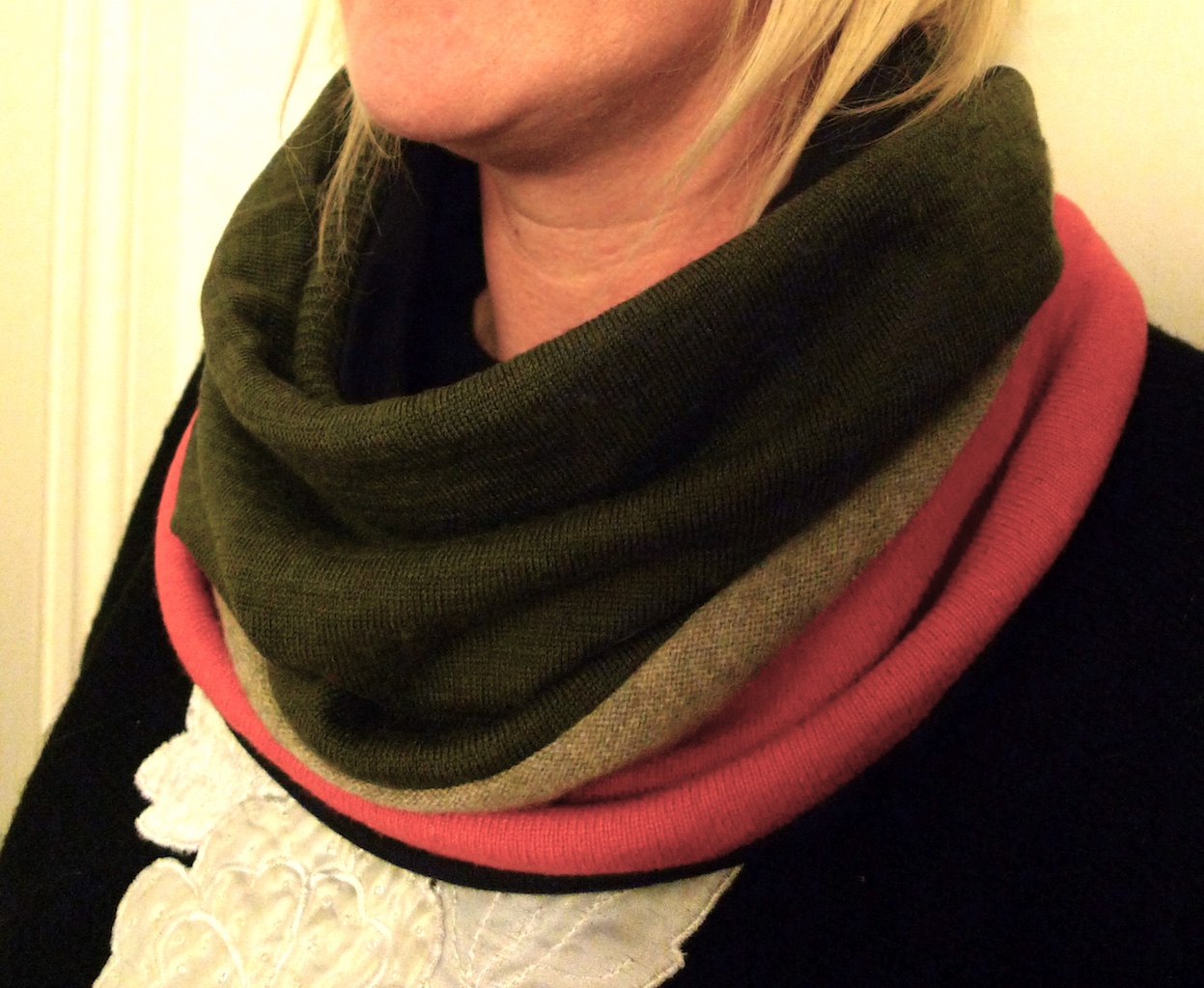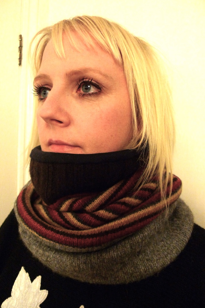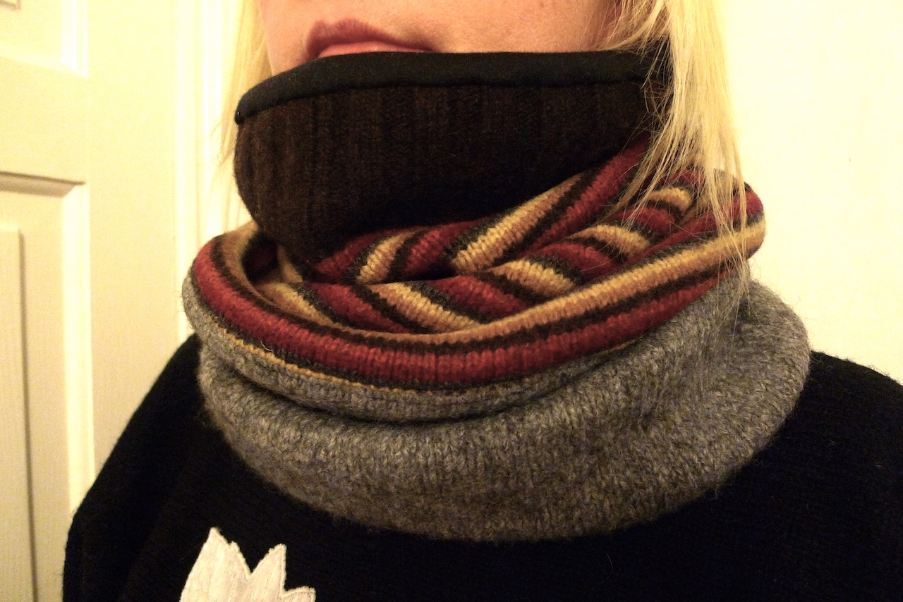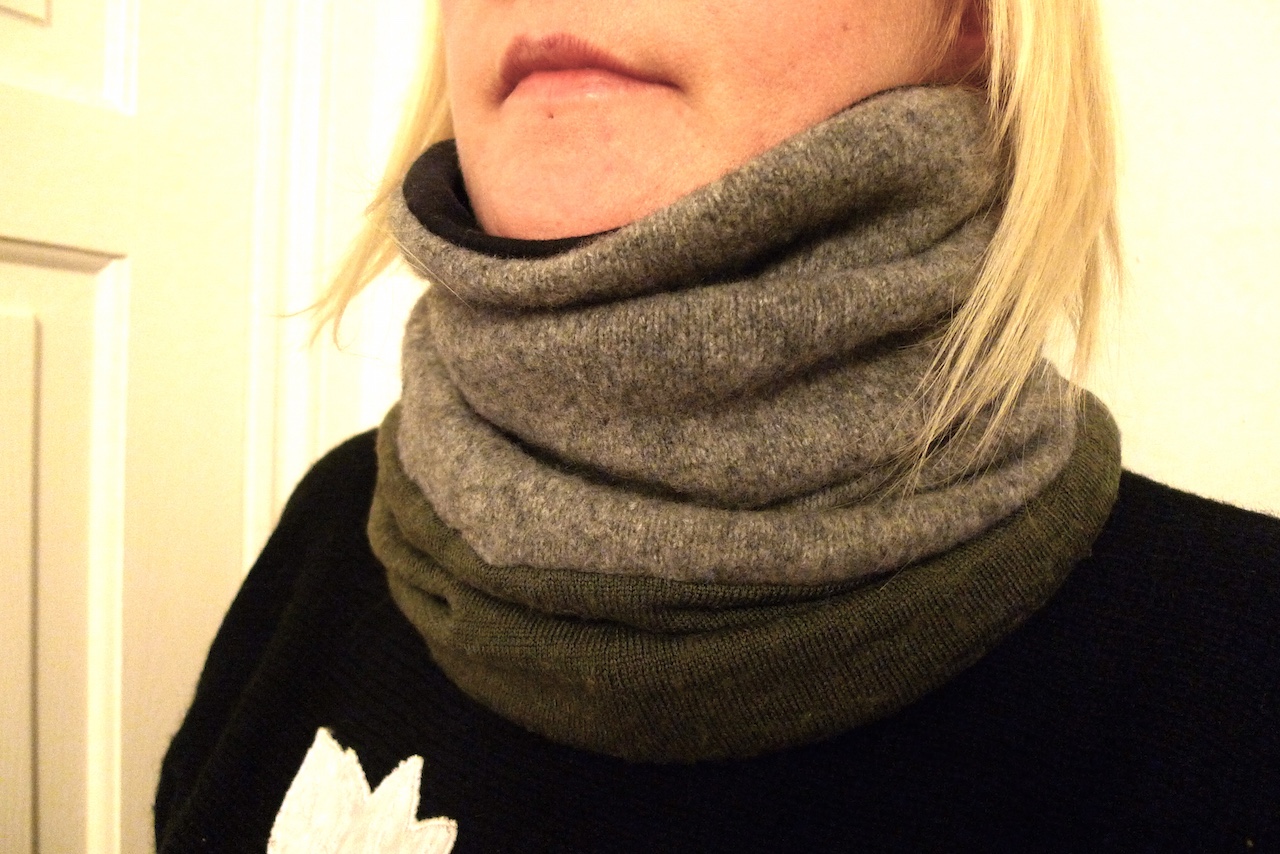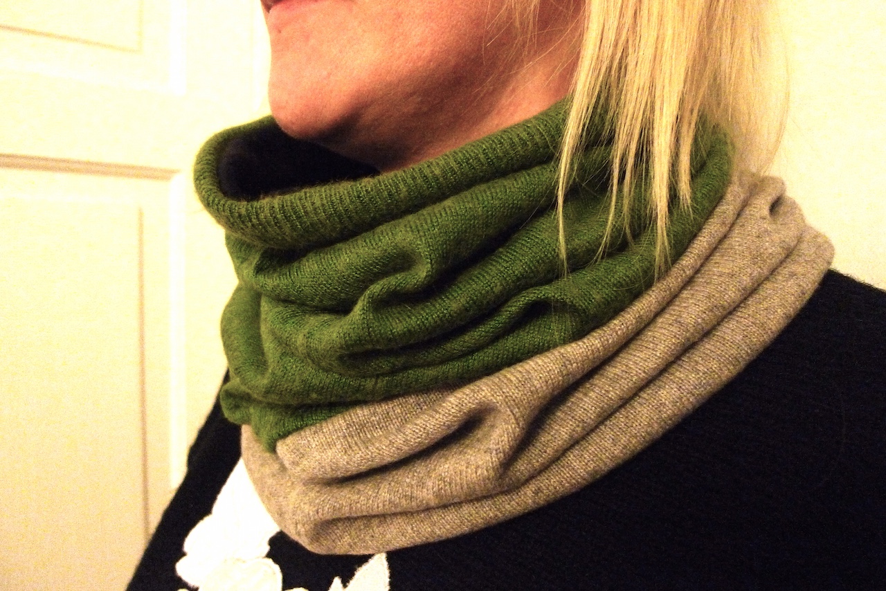 If they have passed the stage of being a jumper, this is one way of re-purposing them.The wrist warmers are made from the sleeves obviously. The snood is made from the body part of the jumper and lined with a soft jersey so the inside is nice and soft against your skin. Snug.