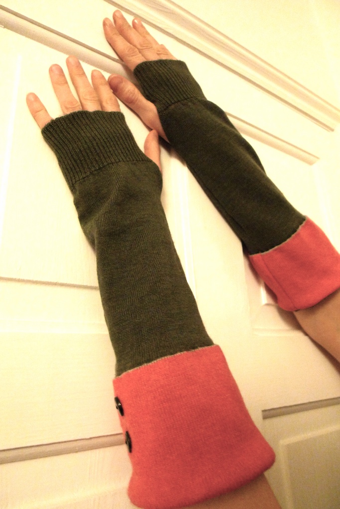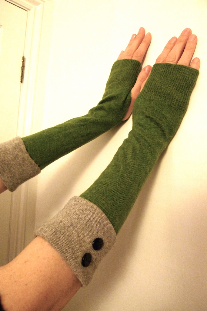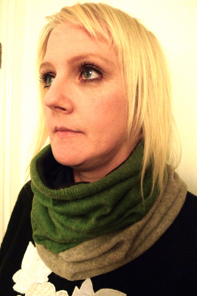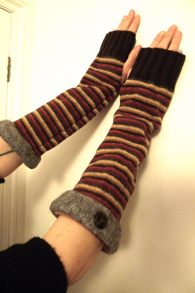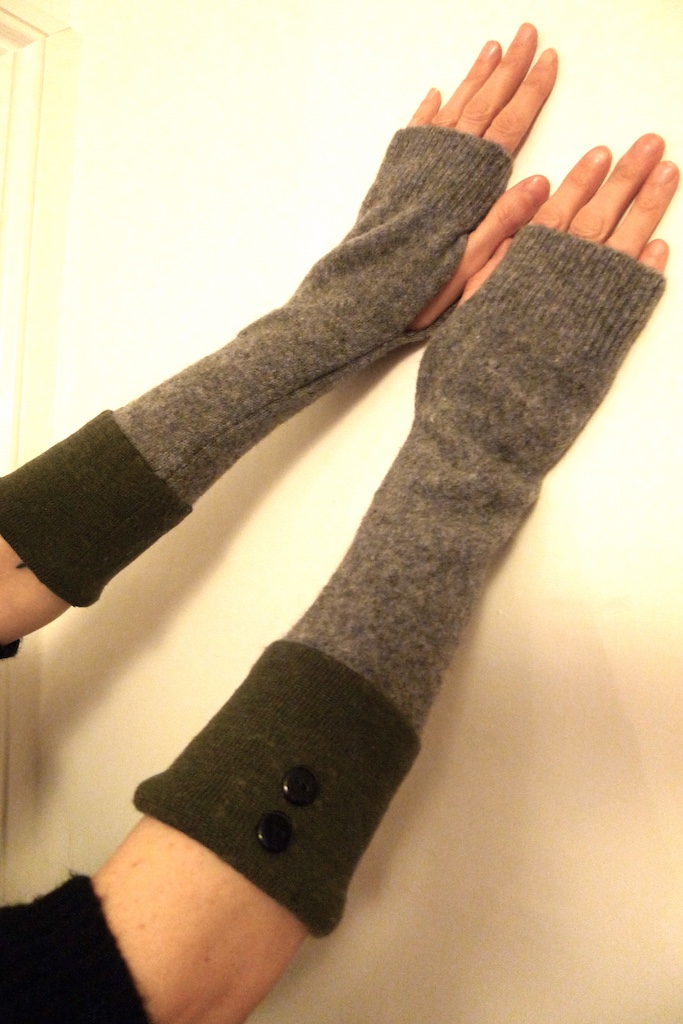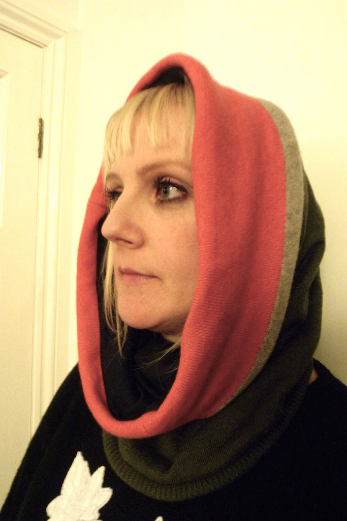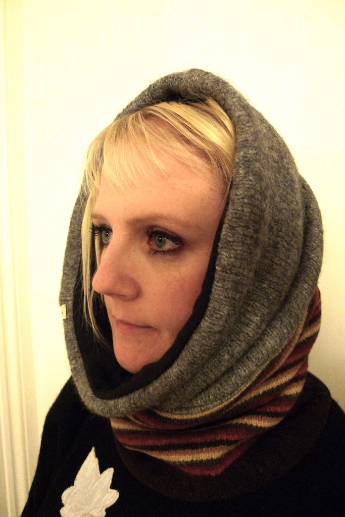 If they have passed the stage of being a jumper, this is one way of re-purposing them.The wrist warmers are made from the sleeves obviously. The snood is made from the body part of the jumper and lined with a soft jersey so the inside is nice and soft against your skin. Snug.