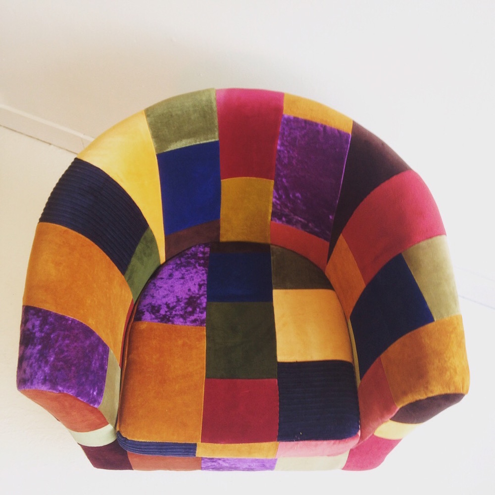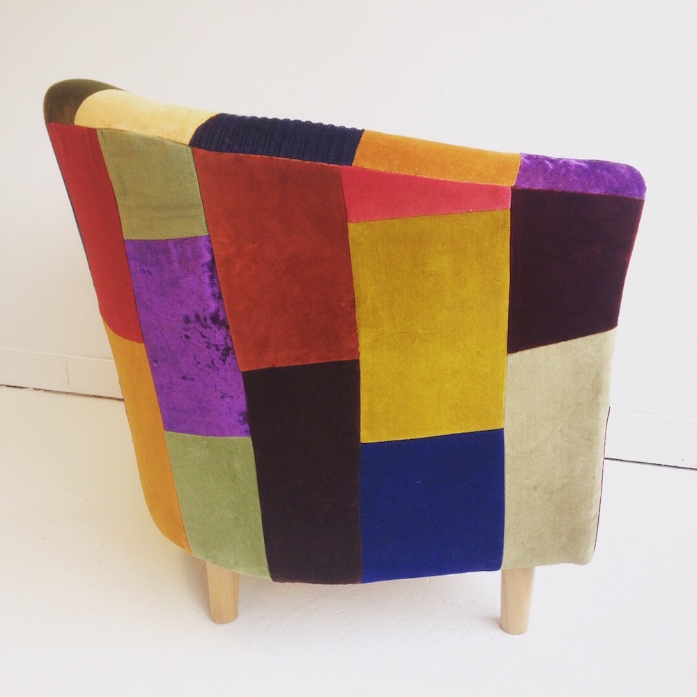 Looking at my previous armchair post, it was nearly three years ago I upholstered one of these. Well overdue! I found a bag of ready cut pieces of material from the last chair, added a few new colours into it, mainly all from vintage velvet curtains.