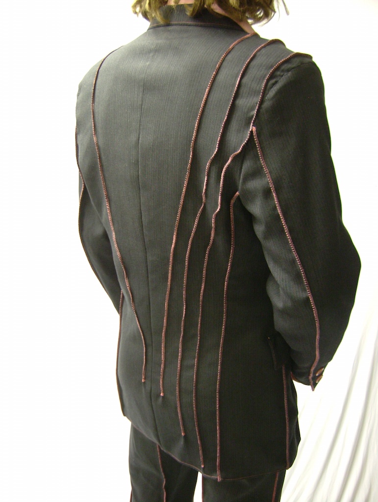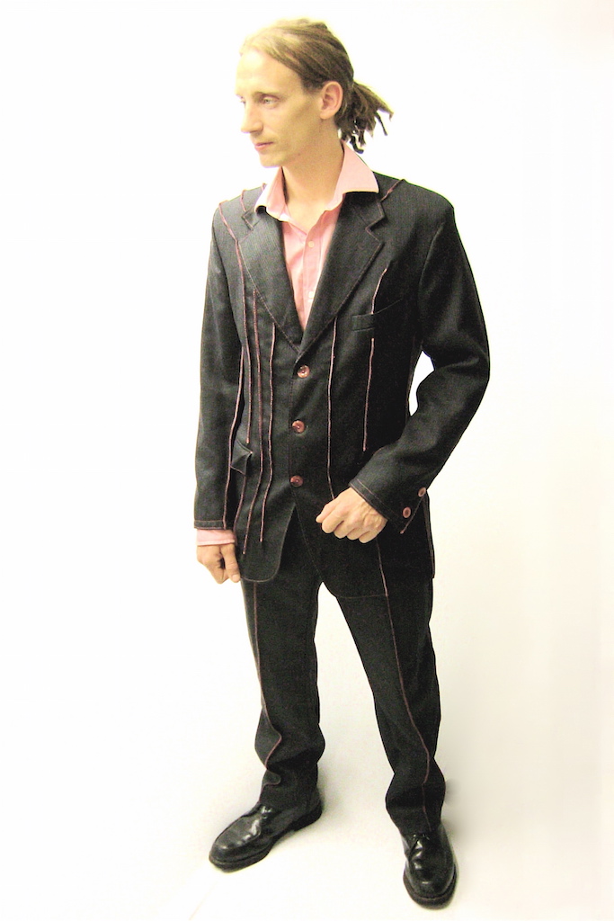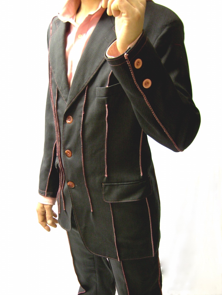 I experimented with adding a some lines by stitching on the jacket and trousers. I also changed all the buttons to match the thread colour. Here is the outcome.