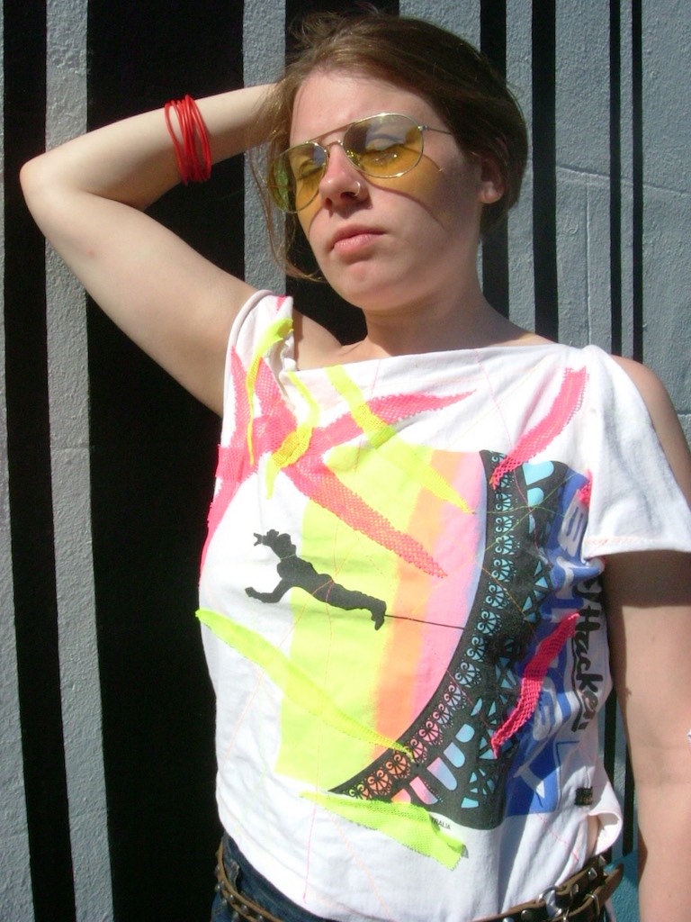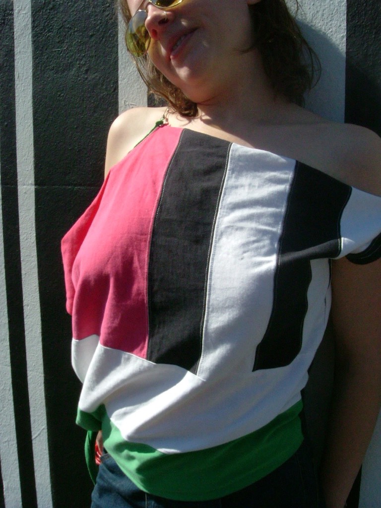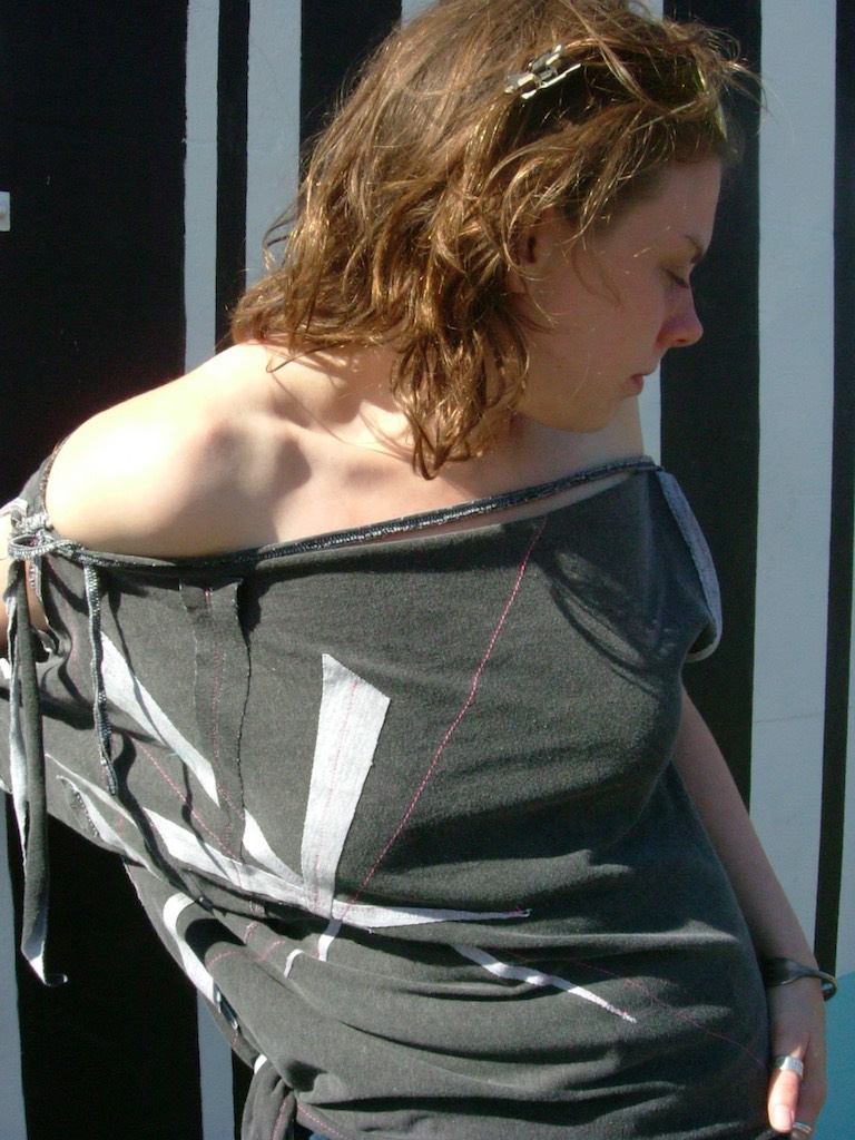 Here is another easy and fun t-shirt upcycling idea. These are all ordinary tees that I have turned 90 degrees and made the neckline into the sleeve. The original sleeve ends up as a shoulder tie and waist tie. Fun project to do with those old tees. No sewing skills needed.