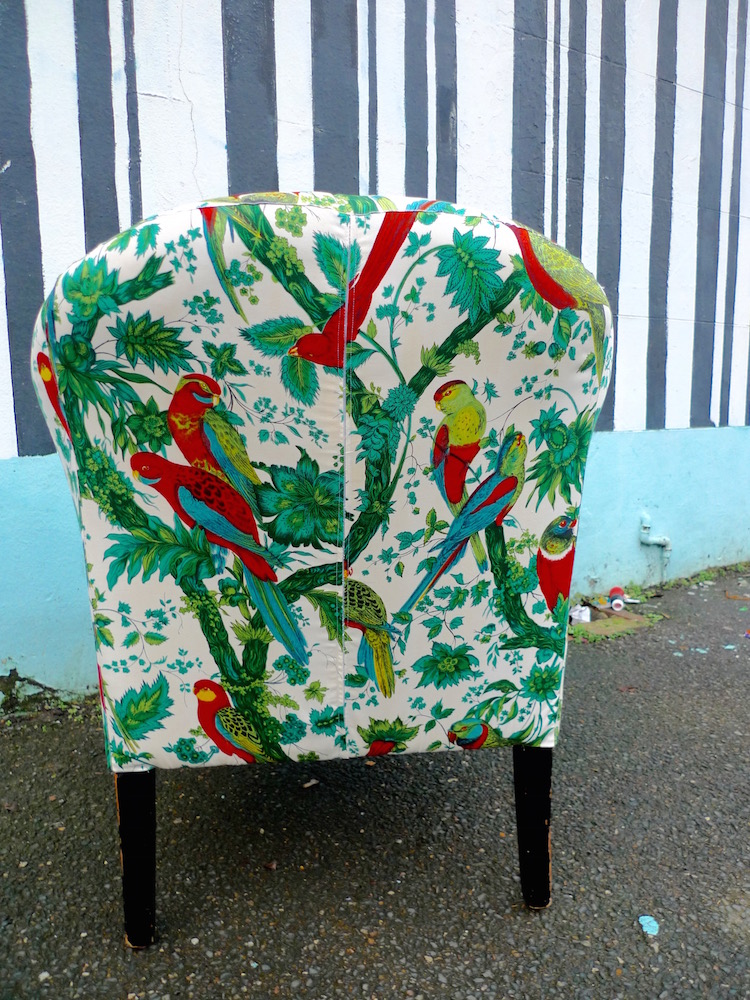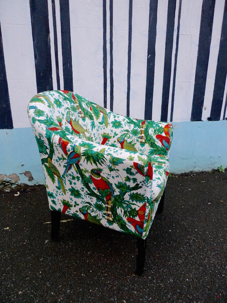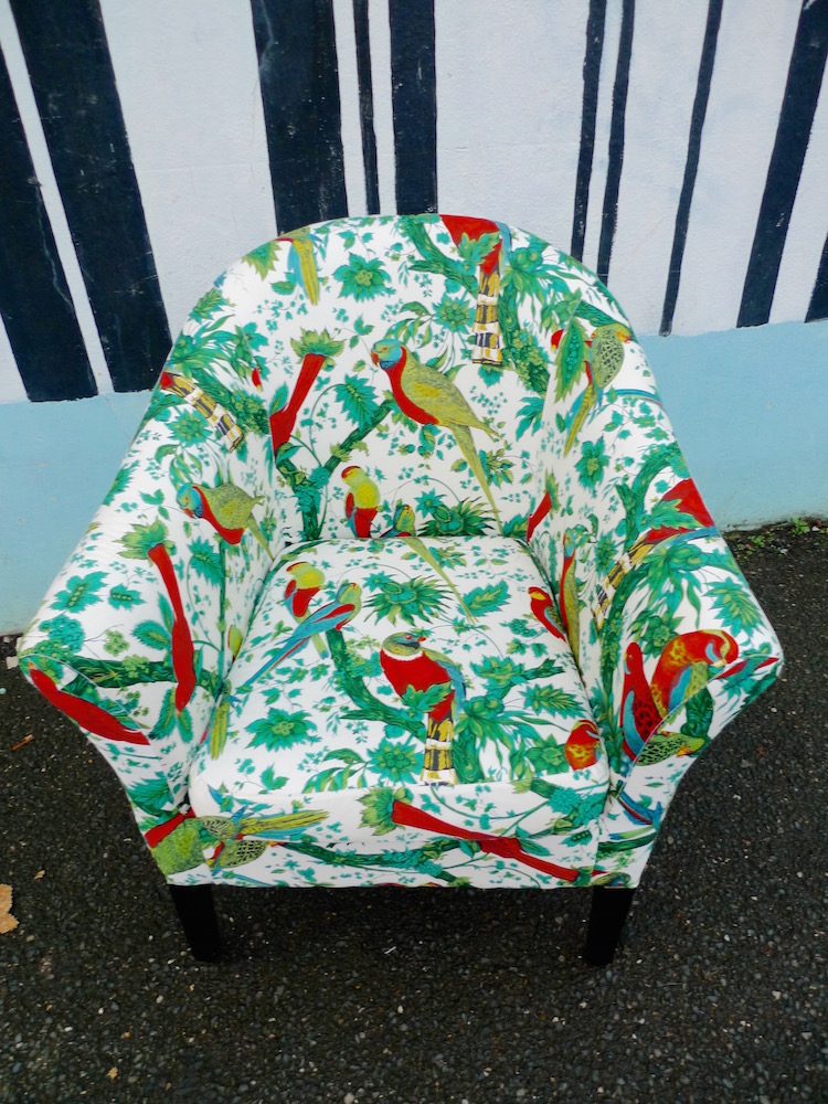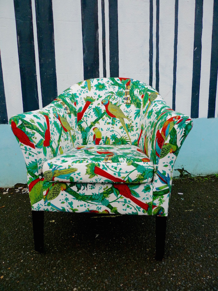 My good friends Dan and Millie are about to have a baby. Consequently they are going to need a nursing chair. Fortunately they had found an armchair that they found comfortable but needed recovering. Millie had these fab pair of curtains that she wanted to re-purpose so all that was left to me was to put the pieces together. I think little D is going to approve.